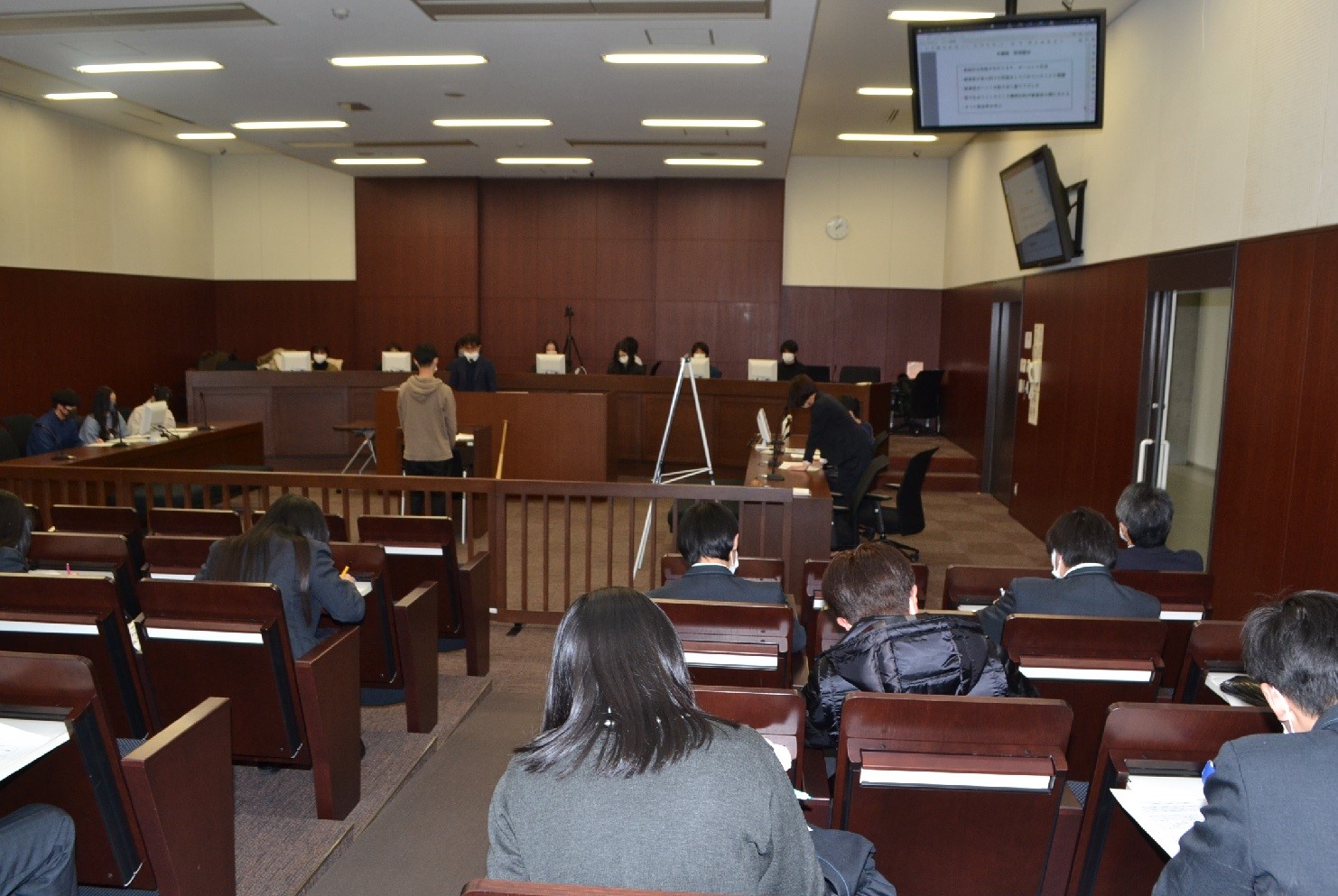 法学部の春日勉教授の3年次ゼミ生らが1月18日、ポートアイランド第1キャンパスの法廷教室で模擬裁判を行い、4月に入学して法学部に在籍する予定の神戸学院大学附属高等学校3年生約30人がスクーリングで傍聴席から見学しました。